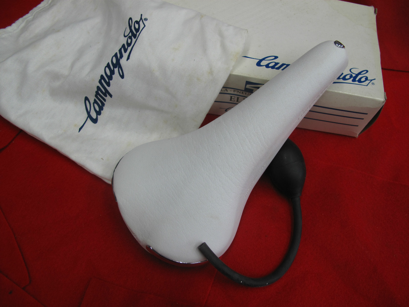 Electa saddles were made briefly by Campagnolo in the mid-1980s. They feature the "Sella-Pneumatic System," which allowed the rider to fine-tune the firmness of the saddle by inflating and deflating a bladder sandwiched between the leather upper and the saddle shell.